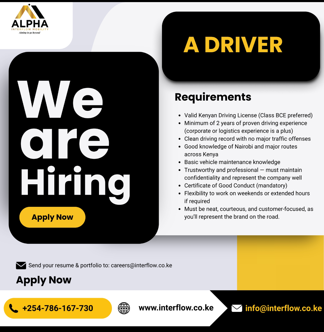 Alpha Interflow Mobility is seeking a reliable, professional, and customer-focused Driver to support our growing car rental and chauffeured transport operations. The ideal candidate will demonstrate excellent road discipline, strong customer service skills, and a commitment to safety and professionalism.